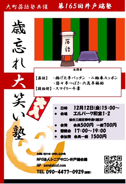 2025年11月24日 / 最終更新日時 : 2025年11月24日 admin1126 お知らせ 歳忘れ大笑塾(第165回井戸端塾)のご案内 一年の締めは井戸端塾で大いに笑って下さい。 今回も落語、腹話術をお楽しみいただきます。 井戸端会議会員も出演します! 塾の後は忘年会を兼ねた懇親会も開催しますので、こちらも是非ご参加をお待ちしています。(井戸端塾運営委員会) Follow me! Facebook